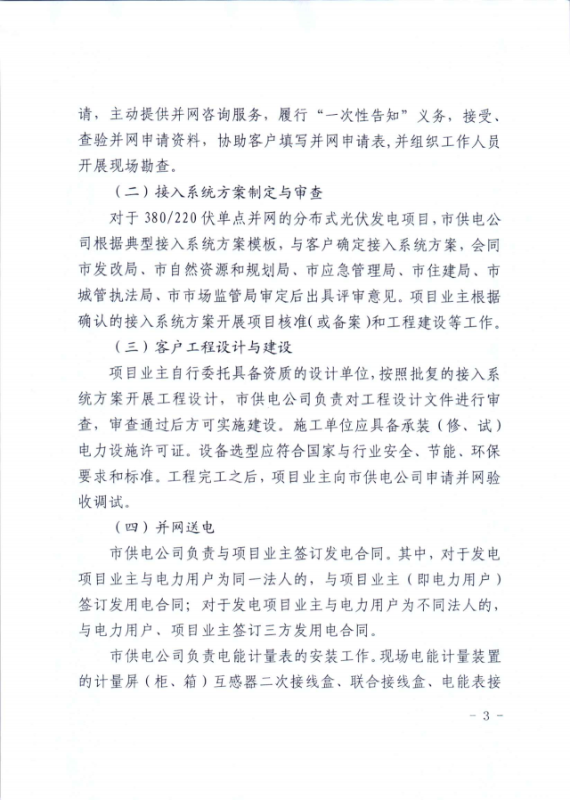 并網(wǎng)方面,則是對(duì)于380/220伏單點(diǎn)并網(wǎng)的分布式光伏發(fā)電項(xiàng)目,市供電公司根據(jù)典型接入系統(tǒng)方案模板,與客戶(hù)確定接入系統(tǒng)方案,會(huì)同市發(fā)改局、市自然資源和規(guī)劃局、市應(yīng)急管理局、市住建局、市城管執(zhí)法局、市市場(chǎng)監(jiān)管局審定后出具評(píng)審意見(jiàn)。項(xiàng)目業(yè)主根據(jù)確認(rèn)的接入系統(tǒng)方案開(kāi)展項(xiàng)目核準(zhǔn)(或備案)和工程建設(shè)等工作。