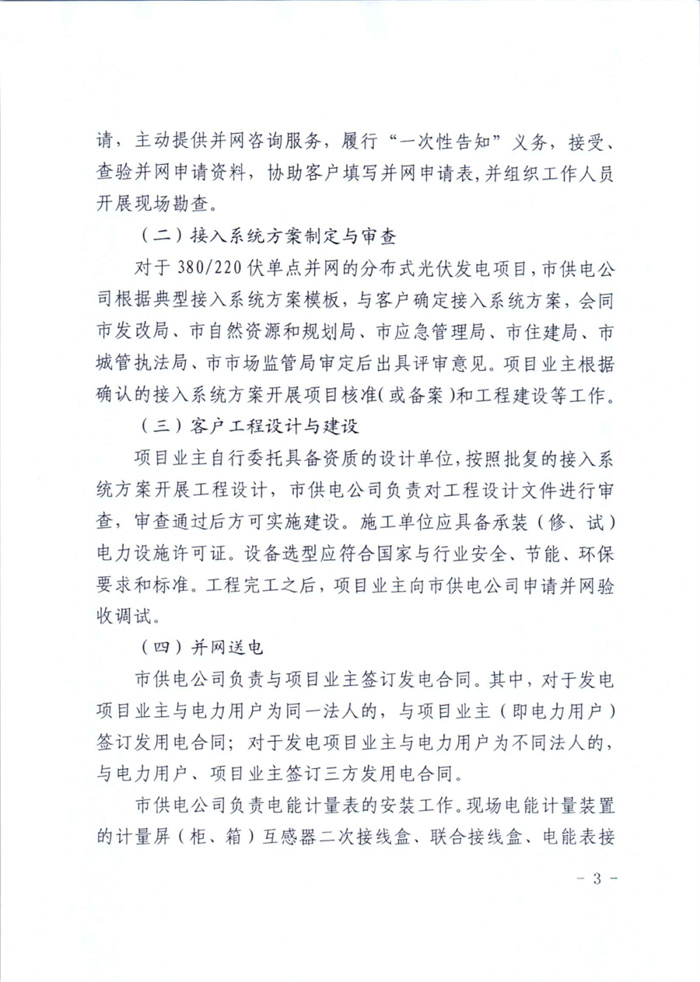 并網(wǎng)方面,則是對于380/220伏單點(diǎn)并網(wǎng)的分布式光伏發(fā)電項(xiàng)目,市供電公司根據(jù)典型接入系統(tǒng)方案模板,與客戶確定接入系統(tǒng)方案,會(huì)同市發(fā)改局、市自然資源和規(guī)劃局、市應(yīng)急管理局、市住建局、市城管執(zhí)法局、市市場監(jiān)管局審定后出具評審意見。項(xiàng)目業(yè)主根據(jù)確認(rèn)的接入系統(tǒng)方案開展項(xiàng)目核準(zhǔn)(或備案)和工程建設(shè)等工作。