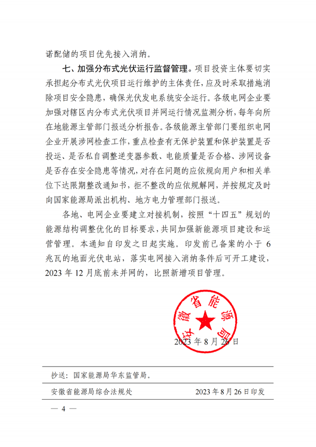 另外,印發(fā)前已備案的小于6兆瓦的地面光伏電站,落實(shí)電網(wǎng)接入消納條件后可開工建設(shè),2023年12月底前未并網(wǎng)的,比照新增項(xiàng)目管理。