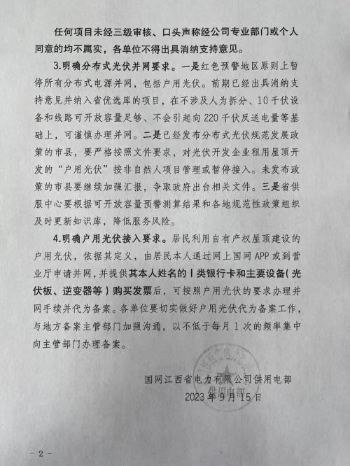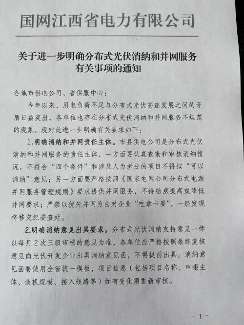 日前,國網江西省下發(fā)《關于進一步明確分布式光伏消納和并網服務有關事項的通知》,明確要求紅色預警地區(qū)暫停戶用光伏并網,企業(yè)租用屋頂開發(fā)的戶用光伏按非自然人管理或暫停接入,任何項目未經三級審核均不得出具消納意見。