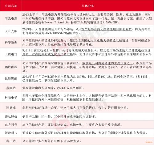 業(yè)內人士表示,隨著2023年美國光伏裝機重新恢復增長及ITC補貼力度的加大,預計美國儲能需求將恢復翻倍以上的增速。對此,不少儲能企業(yè)紛紛加速“出海”,以全面進軍海外市場為主要目標。據財聯社不完全整理,在海外有布局儲能相關業(yè)務的上市公司主要為陽光電源、天合光能、科華數據、上能電氣、鵬輝能源、億緯鋰能、欣旺達、科陸電子、固德威、盛弘股份、東方日升、派能科技、科士達等,具體情況如下: