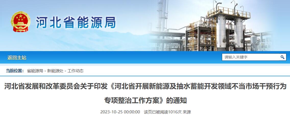 10月25日,河北省發(fā)展和改革委員會發(fā)布關(guān)于印發(fā)《河北省開展新能源及抽水蓄能開發(fā)領(lǐng)域不當(dāng)市場干預(yù)行為專項整治工作方案》(以下簡稱《方案》)的通知。