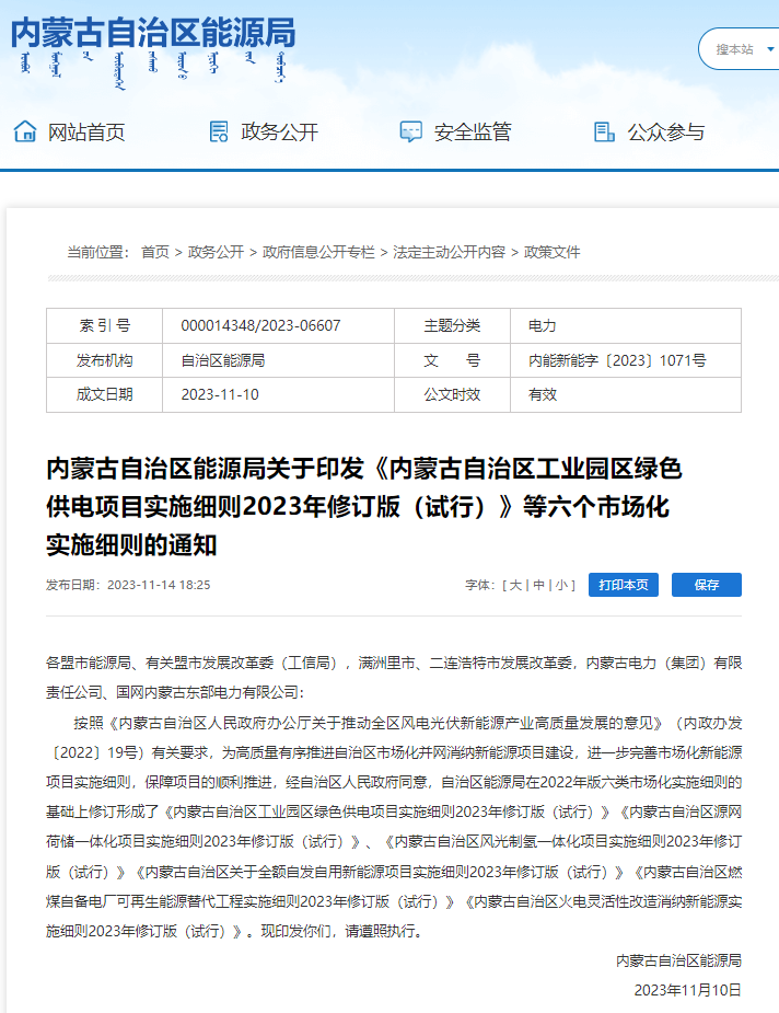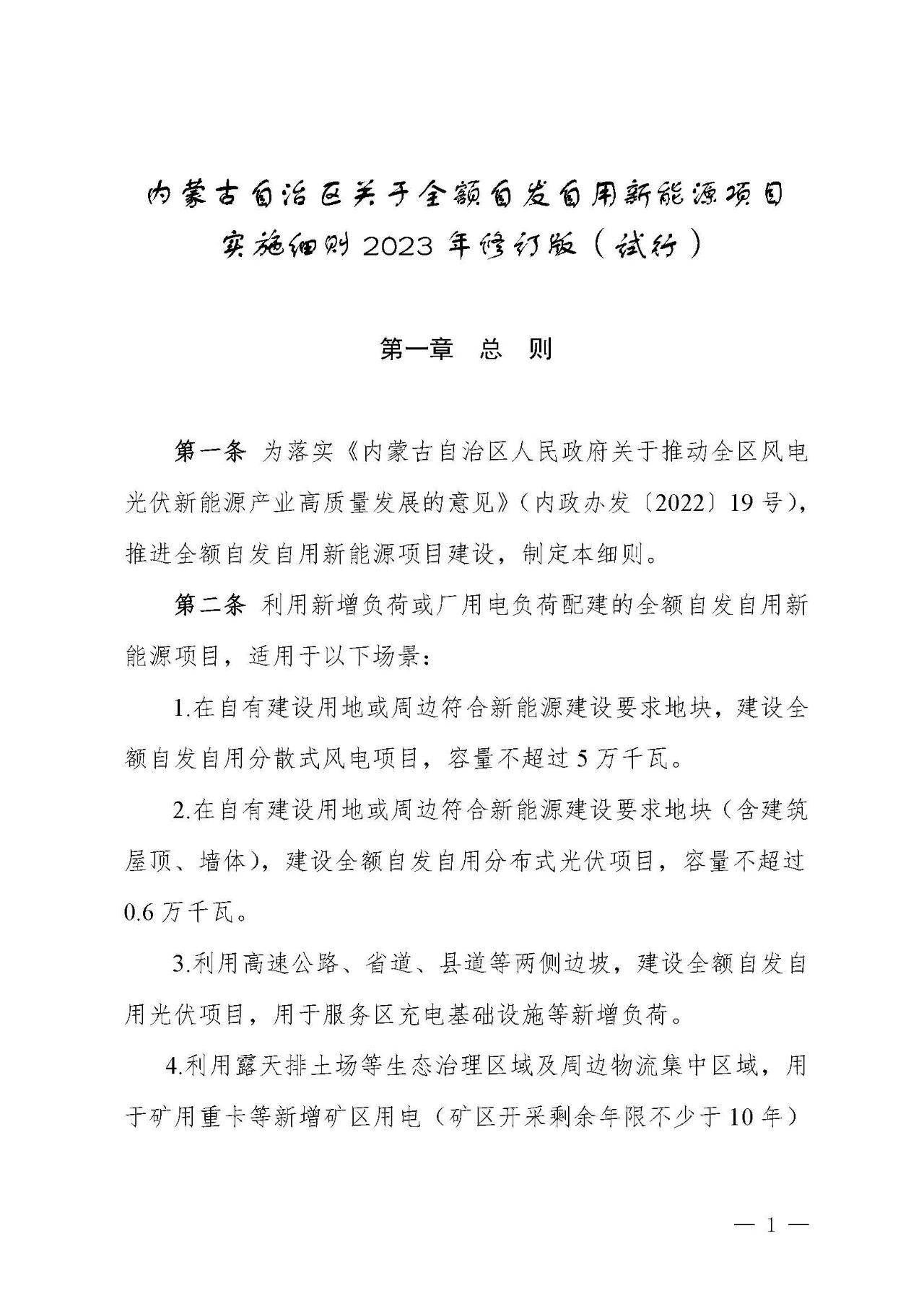 日前,內(nèi)蒙古自治區(qū)能源局官網(wǎng)發(fā)布內(nèi)蒙古自治區(qū)關(guān)于全額自發(fā)自用新能源項(xiàng)目實(shí)施細(xì)則 2023 年修訂版(試行)。