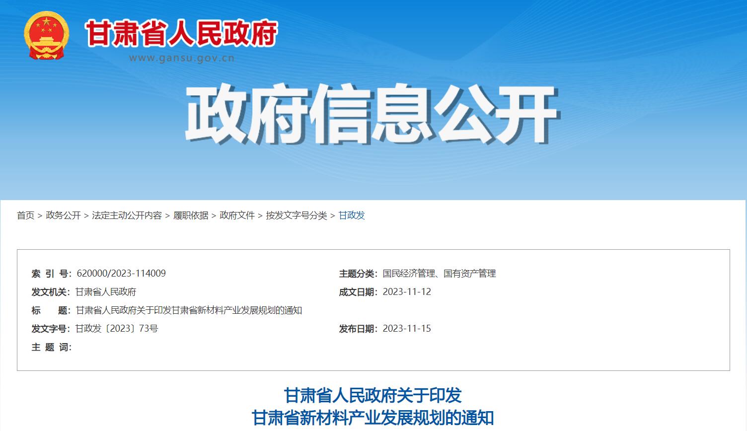 11月23日,甘肅省人民政府關于印發(fā)甘肅省新材料產(chǎn)業(yè)發(fā)展規(guī)劃的通知,通知指出,發(fā)展目標:到2030年,全省新材料產(chǎn)業(yè)規(guī)模實力、集群效應、創(chuàng)新能力實現(xiàn)新發(fā)展,新材料產(chǎn)業(yè)產(chǎn)值超過3000億元,年均增速20%左右,不斷滿足傳統(tǒng)產(chǎn)業(yè)轉(zhuǎn)型升級和戰(zhàn)略性新興產(chǎn)業(yè)創(chuàng)新發(fā)展需求,建設成為國內(nèi)重要、西部領先的新材料產(chǎn)業(yè)集群地。