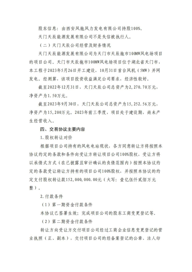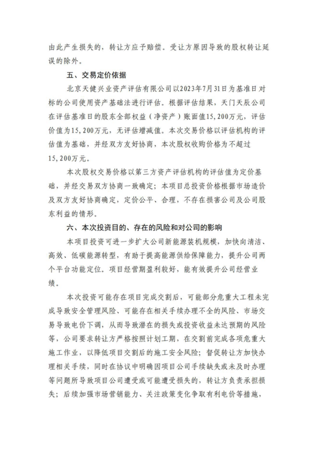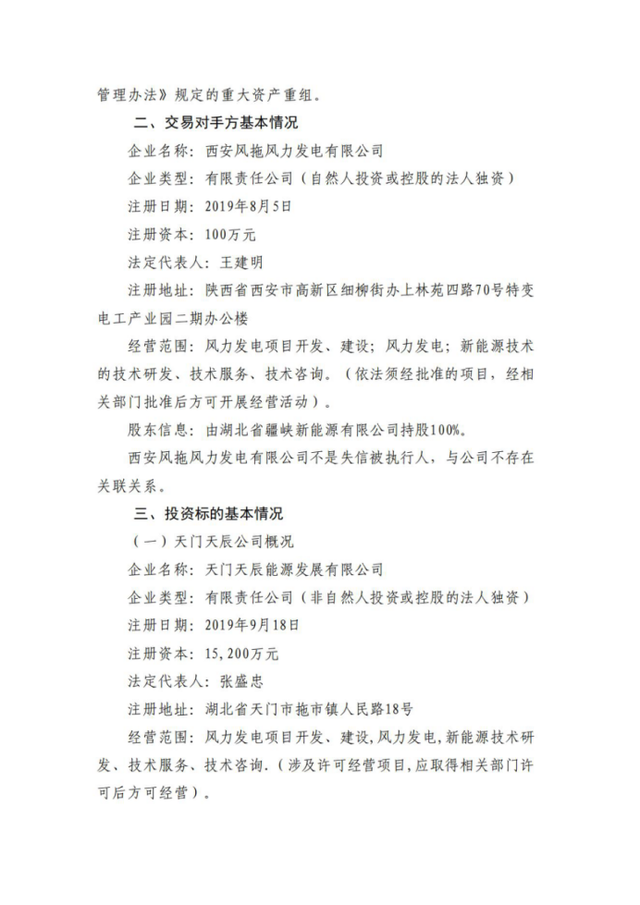 以股權對價不超過15,200萬元收購天門天辰能源發(fā)展有限公司100%股權,承接其全部資產(chǎn)及經(jīng)審計確認的負債,總投資不超過73,852萬元。天門天辰公司為天門市天辰拖市100MW風電場項目公司。