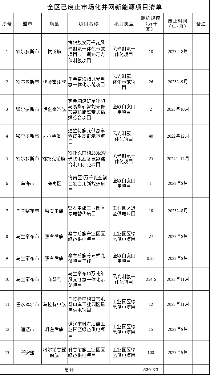 12月4日,內(nèi)蒙古自治區(qū)能源局對(duì)各盟市已廢止的市場(chǎng)化并網(wǎng)新能源項(xiàng)目進(jìn)行了公告,合計(jì)13個(gè)項(xiàng)目,涉及裝機(jī)規(guī)模超530萬(wàn)千瓦,項(xiàng)目清單如下:
