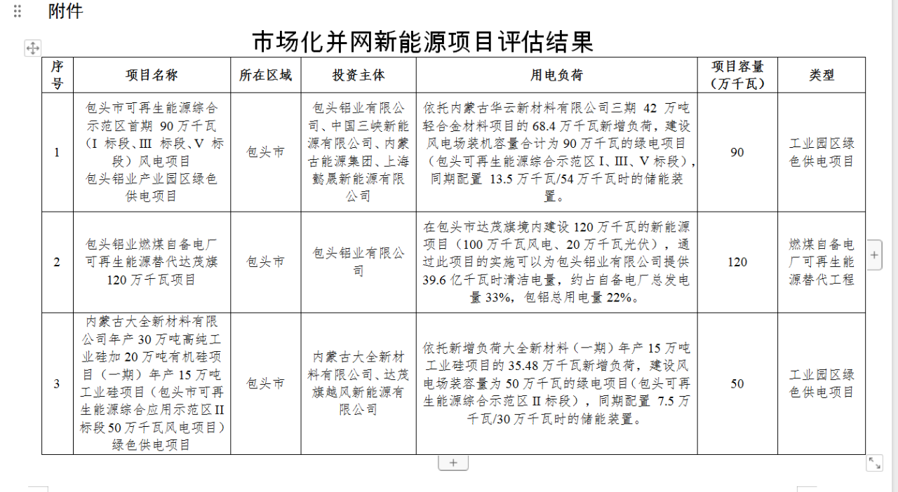 3個(gè)項(xiàng)目均納入市場(chǎng)化并網(wǎng)新能源項(xiàng)目清單,共配建新能源規(guī)模260萬千瓦,其中風(fēng)電240萬千瓦、光伏20萬千瓦。分別是:包頭鋁業(yè)有限公司、中國三峽新能源有限公司、內(nèi)蒙古能源集團(tuán)、上海懿晟新能源有限公司聯(lián)合投資的包頭鋁業(yè)產(chǎn)業(yè)園區(qū)綠色供電項(xiàng)目,項(xiàng)目容量90萬千瓦;2.包頭鋁業(yè)有限公司投資的包頭鋁業(yè)燃煤自備電廠可再生能源替代達(dá)茂旗120萬千瓦項(xiàng)目;3.內(nèi)蒙古大全新材料有限公司、達(dá)茂旗越風(fēng)新能源有限公司聯(lián)合投資的“內(nèi)蒙古大全新材料有限公司年產(chǎn)30萬噸高純工業(yè)硅加20萬噸有機(jī)硅項(xiàng)目(一期)年產(chǎn)15萬噸工業(yè)硅項(xiàng)目(包頭市可再生能源綜合應(yīng)用示范區(qū)II 標(biāo)段50萬千瓦風(fēng)電項(xiàng)目)綠色供電項(xiàng)目”。