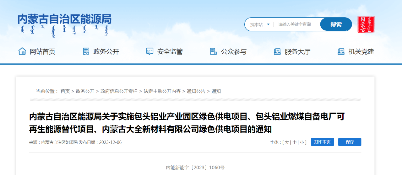 日前,內(nèi)蒙古自治區(qū)能源局網(wǎng)站發(fā)布“內(nèi)蒙古自治區(qū)能源局關(guān)于實(shí)施包頭鋁業(yè)產(chǎn)業(yè)園區(qū)綠色供電項(xiàng)目、包頭鋁業(yè)燃煤自備電廠可再生能源替代項(xiàng)目、內(nèi)蒙古大全新材料有限公司綠色供電項(xiàng)目的通知”(內(nèi)能新能字〔2023〕1060號(hào)),根據(jù)文件,自治區(qū)能源局組織評(píng)估單位和專家在《包頭市新能源新場(chǎng)景應(yīng)用方案》的基礎(chǔ)上,對(duì)包頭市申報(bào)的市場(chǎng)化新能源項(xiàng)目子方案進(jìn)行了評(píng)估。