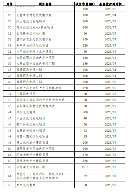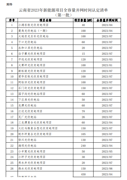 根據(jù)《云南省發(fā)展和改革委員會(huì) 云南省能源局關(guān)于云南省光伏發(fā)電上網(wǎng)電價(jià)政策有關(guān)事項(xiàng)的通知》(云發(fā)改價(jià)格〔2023〕319號(hào))以及《云南省發(fā)展和改革委員會(huì) 云南省能源局關(guān)于進(jìn)一步完善風(fēng)電上網(wǎng)電價(jià)政策有關(guān)事項(xiàng)的通知》(云發(fā)改價(jià)格〔2023〕665號(hào))文件精神,新能源全容量并網(wǎng)時(shí)間的認(rèn)定由省能源局會(huì)同云南電網(wǎng)公司負(fù)責(zé)。為加強(qiáng)社會(huì)監(jiān)督,廣泛征求意見(jiàn),現(xiàn)將經(jīng)認(rèn)定后的項(xiàng)目清單予以公示,有關(guān)情況如下: