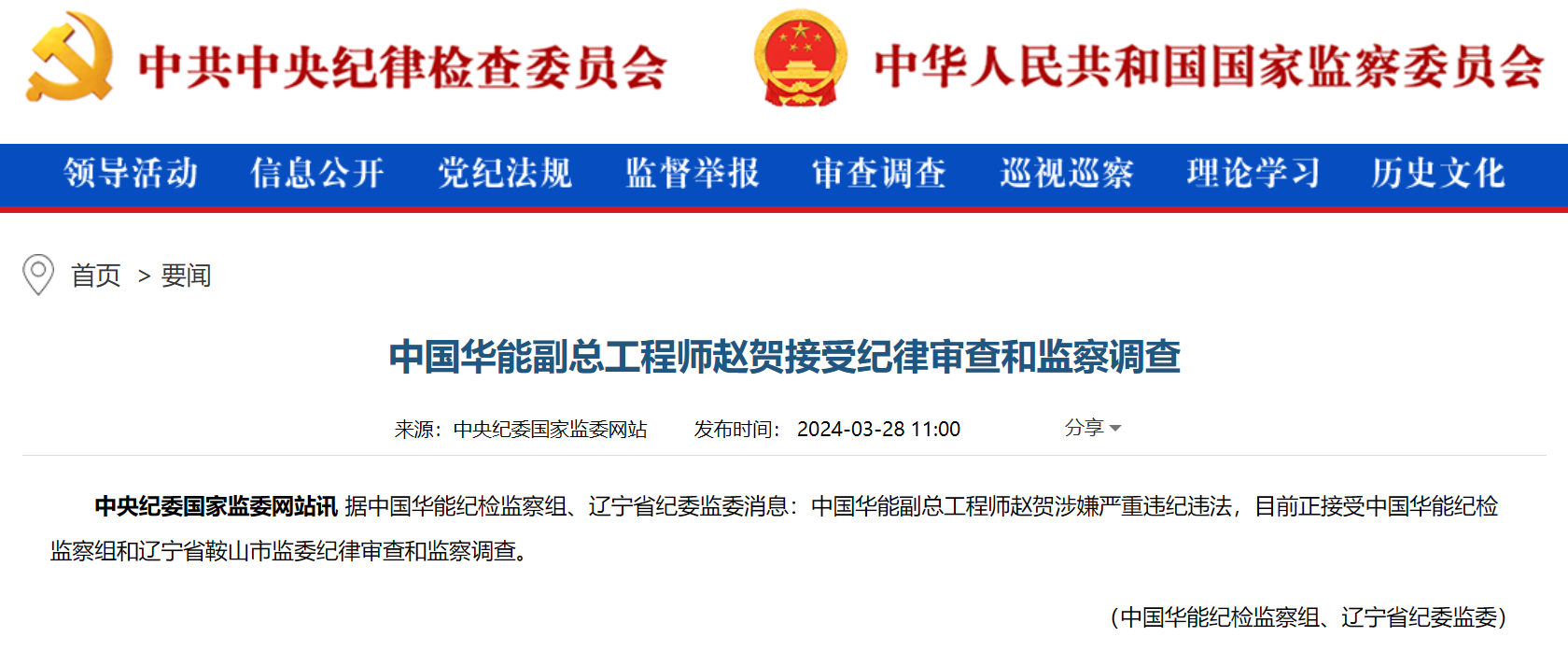 3月28日,中央紀(jì)委國家監(jiān)委網(wǎng)站訊 據(jù)中國華能紀(jì)檢監(jiān)察組、遼寧省紀(jì)委監(jiān)委消息:中國華能副總工程師趙賀涉嫌嚴(yán)重違紀(jì)違法,目前正接受中國華能紀(jì)檢監(jiān)察組和遼寧省鞍山市監(jiān)委紀(jì)律審查和監(jiān)察調(diào)查。