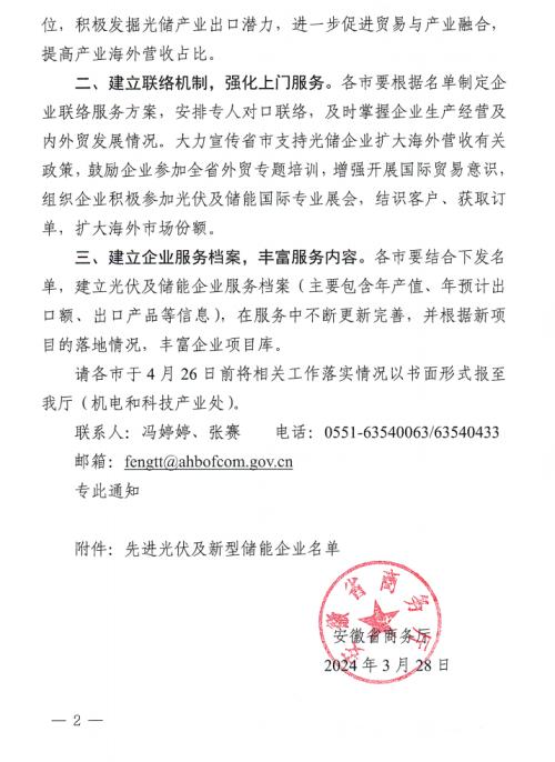 文件要求,各市要根據(jù)名單制定企業(yè)聯(lián)絡(luò)服務(wù)方案,安排專人對口聯(lián)絡(luò),及時掌握企業(yè)生產(chǎn)經(jīng)營及內(nèi)外貿(mào)發(fā)展情況。大力宣傳省市支持光儲企業(yè)擴大海外營收有關(guān)政策,鼓勵企業(yè)參加全省外貿(mào)專題培訓,增強開展國際貿(mào)易意識組織企業(yè)積極參加光伏及儲能國際專業(yè)展會,結(jié)識客戶、獲取訂單,擴大海外市場份額。