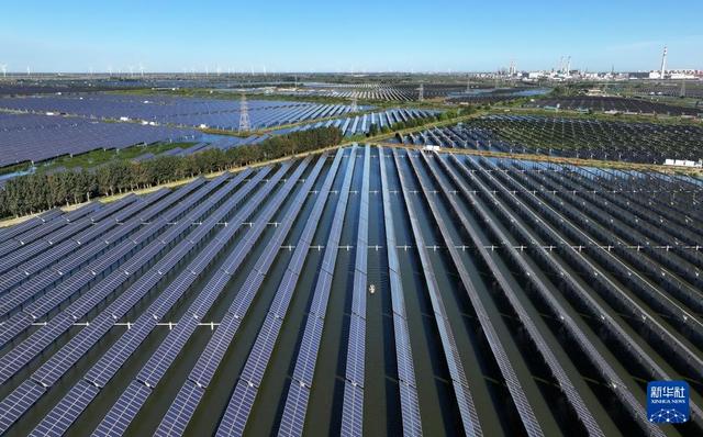 9月24日拍攝的河北省唐山市豐南區(qū)黑沿子鎮(zhèn)一處“漁光互補”發(fā)電場(無人機照片)。