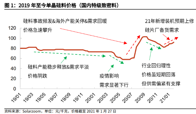 在硅料景氣度高漲的背景下,部分投資者擔(dān)心技術(shù)的更新迭代(顆粒硅技術(shù))將給硅料生產(chǎn)龍頭公司未來的發(fā)展前景帶來不確定性,但是我們認(rèn)為,當(dāng)前硅料環(huán)節(jié)的主要矛盾是2021年供需形式緊張(供不應(yīng)求)帶來的硅料供應(yīng)階段性緊缺,這也將推動硅料價格維持高位,甚至在特定時間或特殊因素催化下突破100元/千克的高位,從而保障硅料龍頭企業(yè)(通威股份、新特能源、東方希望、大全新能源等)2021年的業(yè)績增長和盈利能力維持;技術(shù)更新迭代則是當(dāng)前時點(diǎn)的次要矛盾,F(xiàn)BR顆粒硅技術(shù)的確有望成為下一代光伏的硅料技術(shù),但是目前顆粒硅的產(chǎn)能、下游使用占比仍相對較低,需持續(xù)關(guān)注保利協(xié)鑫2021年6月底顆粒硅產(chǎn)能擴(kuò)產(chǎn)至3萬噸后顆粒硅品質(zhì)的提升、下游硅片廠商應(yīng)用、以及成本的降低情況。(文章來源:光大證券)