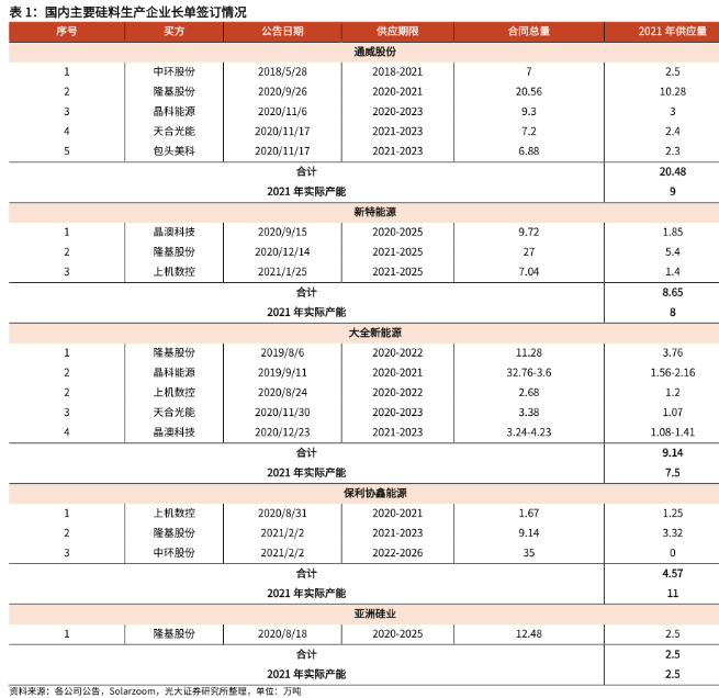 在經(jīng)歷了19年的硅料產(chǎn)能釋放周期后,2020年我國硅料產(chǎn)能增量有限,且海外OCI先后關(guān)停韓國兩家多晶硅工廠(總產(chǎn)能從7.9萬噸滑落至3.2萬噸),2020年國內(nèi)硅料在產(chǎn)產(chǎn)能從2019年的45.6萬噸小幅提升至48.4萬噸,全球硅料在產(chǎn)產(chǎn)能則從2019年底的62.2萬噸減少1.9萬噸至60.3萬噸。2021年,國內(nèi)的新產(chǎn)能投放大多集中在Q4,因此對全年的實(shí)際產(chǎn)能貢獻(xiàn)有限,預(yù)計2021年全球的硅料供應(yīng)量約為55萬噸,可滿足約170GW的硅片生產(chǎn)需求。與此同時,下游的硅片廠商則在高利潤留存的背景下在2019年開啟了大規(guī)模擴(kuò)產(chǎn)浪潮。2019年在上游環(huán)節(jié)價格下跌的情況下硅片價格依然堅(jiān)挺,單晶硅片環(huán)節(jié)相較其他供應(yīng)鏈環(huán)節(jié)仍存在較高的利潤空間,因此各硅片企業(yè)均開啟了較為激進(jìn)的擴(kuò)張計劃,全國單晶硅片總名義產(chǎn)能從2019年的120GW擴(kuò)張至2020年的217GW。展望2021年,各大硅片龍頭及二、三線硅片企業(yè)仍維持了較大規(guī)模的產(chǎn)能擴(kuò)張節(jié)奏,2021年底的單晶硅片名義產(chǎn)能有望再創(chuàng)新高突破300GW。在2021年硅料實(shí)際貢獻(xiàn)有限、而硅片產(chǎn)能大幅擴(kuò)張的背景下,硅片廠商于2020Q3開始密集通過和上游硅料企業(yè)簽訂鎖量不鎖價的硅料供貨長協(xié)鎖定硅料供應(yīng),從而滿足自身的生產(chǎn)需求。根據(jù)我們的統(tǒng)計,2021年已有超過80%的硅料產(chǎn)能被長協(xié)合同鎖定,主流硅料生產(chǎn)廠商中僅有保利協(xié)鑫的部分硅料產(chǎn)能尚未簽訂長協(xié)合同。