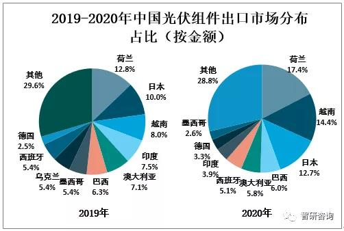 2020年中國光伏組件出口金額為169.9億美元,從2020年中國光伏組件出口市場(chǎng)分布占比來看,多數(shù)傳統(tǒng)市場(chǎng)依然保持活力不減,印度、墨西哥等部分市場(chǎng)受疫情影響有所下降,其中荷蘭占比17.4%,越南占比14.4%,日本占比12.7%。