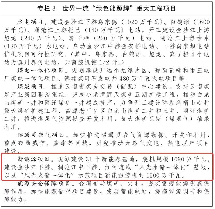 在具體項(xiàng)目方面,“十四五”期間,云南將規(guī)劃建設(shè)31個新能源基地,裝機(jī)規(guī)模為1090萬千瓦,建設(shè)金沙江下游、瀾滄江中下游、紅河流域“風(fēng)光水儲一體化”基地以及“風(fēng)光火儲一體化”示范項(xiàng)目新能源裝機(jī)共1500萬千瓦。