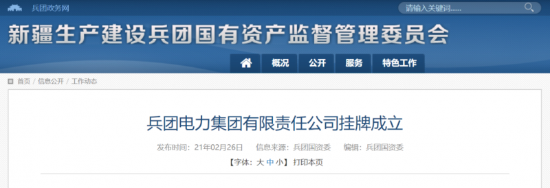 2月26日,從兵團(tuán)國資委獲悉,新疆生產(chǎn)建設(shè)兵團(tuán)電力集團(tuán)有限責(zé)任公司在烏魯木齊舉行揭牌儀式,宣布正式成立。兵團(tuán)電力集團(tuán)有限責(zé)任公司是兵團(tuán)國資國企改革中兵團(tuán)本級成立的第一個產(chǎn)業(yè)集團(tuán)公司,企業(yè)注冊資本金5億元,是新疆電力市場的重要主體和能源產(chǎn)業(yè)的新興力量。