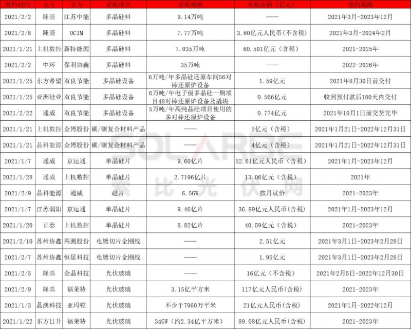 硅片方面,通威與京運通、上機數(shù)控累計簽訂單晶硅片訂單超12億片;晶科能源向通威采購硅片6.5GW;江蘇潤陽向京運通采購硅片9.46億片;正泰向上機數(shù)控采購單晶硅片8.82億片,以上合同采購期限均為2021-2023年。同時,蘇州協(xié)鑫與高測股份、恒星科技簽訂總價4.46億元的電鍍切片金剛線采購項目。