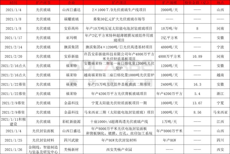 自去年12月16日工信部宣布放開光伏玻璃擴產(chǎn)限制后,2021年開年至今,安彩高科、安彩新能、亞瑪頓紛紛加速光伏玻璃擴產(chǎn)。1月8日,安彩高科宣布與博愛凌創(chuàng)合資成立焦作安彩新材料有限公司,開展年產(chǎn)18萬噸壓延太陽能電池封裝玻璃項目建設。1月17日,亞瑪頓旗下鳳陽硅谷智能有限公司二期項目“年產(chǎn)2億平方米特種超薄鍍膜雙玻組件用玻璃項目”在滁州舉行開工儀式。2月20日,安彩新能年產(chǎn)4800萬平方米光伏輕質基板項目開工,項目投資10.89億,涵蓋1.8~4.0mm厚度光伏玻璃產(chǎn)品,支持超大規(guī)格電池組件。
