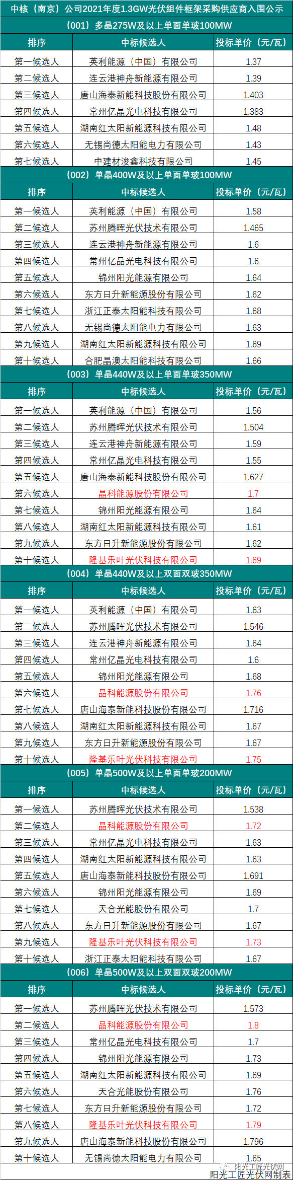根據(jù)陽光工匠光伏網(wǎng)的統(tǒng)計,中核(南京)1.3GW組件集采的開標結果如下表所示。