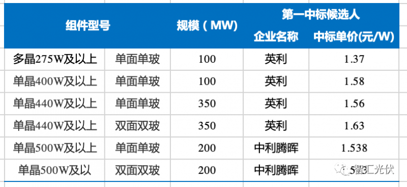 然而,根據(jù)評標結果,實際多晶組件第一候選人價格為1.37元/W,單晶組件第一候選人價格在1.52~1.63元/W之間;因此,實際中標價格可能遠低于最高報價。
