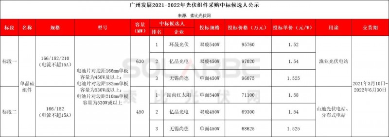 1)廣州發(fā)展1.08GW預期中標價為1.52元/W、1.58元/W