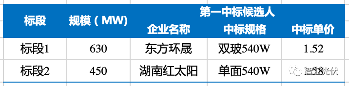 根據(jù)索比光伏網(wǎng)統(tǒng)計,廣州發(fā)展集采標段一中標候選人第一名為環(huán)晟光伏,投標單價1.52元/W,且為最低投標單價,組件投標規(guī)格為雙玻540W;標段二中標候選人第一名為湖南紅太陽,投標單價1.58元/W,組件投標規(guī)格為單面540W。詳情請見下表: