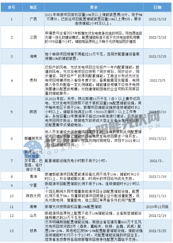 就消納掣肘,光伏電站配置儲能成為政策導向。據北極星太陽能光伏網統(tǒng)計,2021開年以來,廣西、江西、貴州、山東、海南等13個地區(qū)要求風、光項目強配儲能,比例在5%~10%之間,連續(xù)儲能在2小時及以上。然而在儲能經濟性仍未達到預期且獲利商業(yè)模式仍未明朗下,強配儲能對于光伏電站投資業(yè)主來說無疑是雪上加霜。
