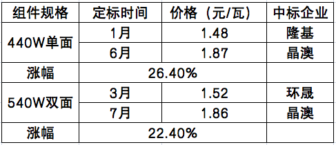 在價格方面,2021年上半年隨著組價集采的推進,組件價格受硅料上漲影響,其報價也呈現(xiàn)快速上漲的趨勢。從年初中核集團第一批1.3GW組件集采,隆基單面450組件報出1.48/瓦元的中標(biāo)價格,到今年6月蒙能包頭50MW技術(shù)領(lǐng)跑項目中晶澳以450單面1.87元/瓦的中標(biāo)價格拿下上半年“標(biāo)王”,組件漲幅約26%左右。相較于去年1.55元/瓦的定標(biāo)均價而言,今年440+組件已經(jīng)來到1.7元/瓦上下;540雙面則由3月廣東電力第一批組件集采的1.52元/瓦的中標(biāo)價上漲至7月廣東電力第三批組件集采的1.86元/瓦中標(biāo)價格,漲幅約22.37%。