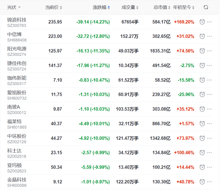 作為資本市場(chǎng)重要板塊,光伏行業(yè)很難置身事外,超80%光伏概念股今日出現(xiàn)下跌,電氣設(shè)備板塊整體跌幅5.79%。具體看,愛旭股份、南玻A、福萊特、中環(huán)股份、科士達(dá)、亞瑪頓、金晶科技等7只股票跌停,錦浪科技、中信博、陽(yáng)光電源、捷佳偉創(chuàng)、珈偉新能等5只身處創(chuàng)業(yè)板、科創(chuàng)板的股票跌幅超過10%,超30只股票跌幅超過5%,就連光伏ETF(SH:515790)也罕見地出現(xiàn)6.98%下跌。