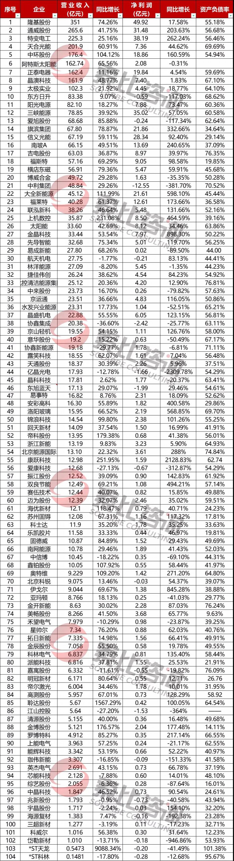 從營收來看,2021年上半年104家企業(yè)總營收3712億元,同比增長146%。光伏龍頭企業(yè)隆基股份以351億元的營業(yè)收入位居榜首,遙遙領(lǐng)先;通威股份、特變電工、天合光能、中環(huán)股份位居前五。