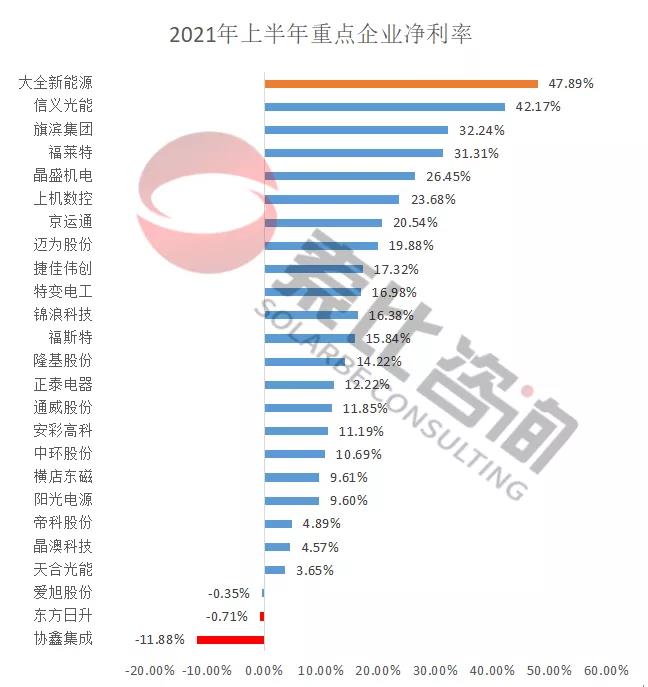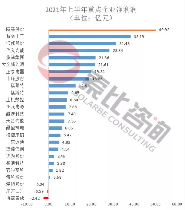 從凈利潤來看,2021年上半年104家企業(yè)凈利潤合計450.58億元,同比增長61.72%。光伏龍頭企業(yè)隆基股份以凈利潤49.92億元,位居榜首;特變電工以38.19億元,位居第二。