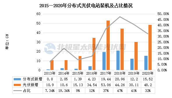 根據(jù)國(guó)家能源局公布的數(shù)據(jù),2019年戶用光伏實(shí)際新增裝機(jī)達(dá)到4.18GW。占全國(guó)裝機(jī)17.6%,成為2019年新增裝機(jī)中的亮點(diǎn)。2020年戶用光伏表現(xiàn)的更為“搶眼”,新增裝機(jī)規(guī)模達(dá)到了10.1GW,占總裝機(jī)的21%,占分布式光伏的67%。