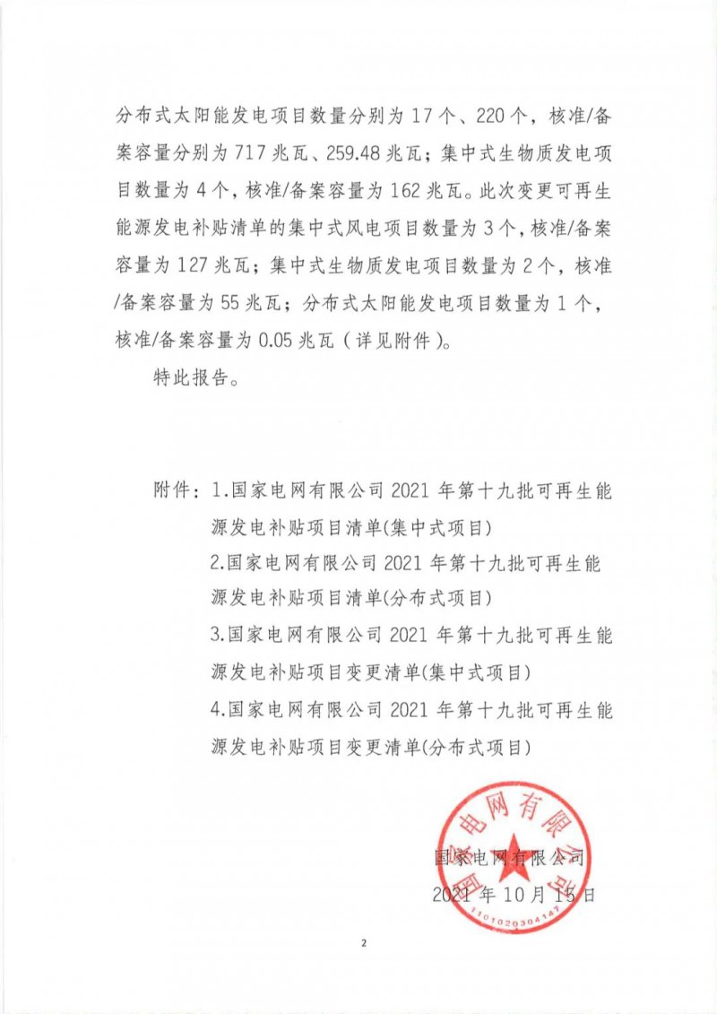 2021年10月15日,我公司已將完成公示的2021年第十九批可再生能源發(fā)電項目補貼項目清單上報國家主管部門,第十九批項目清單及后續(xù)項目審核進展情況,請登錄新能源云平臺查詢。