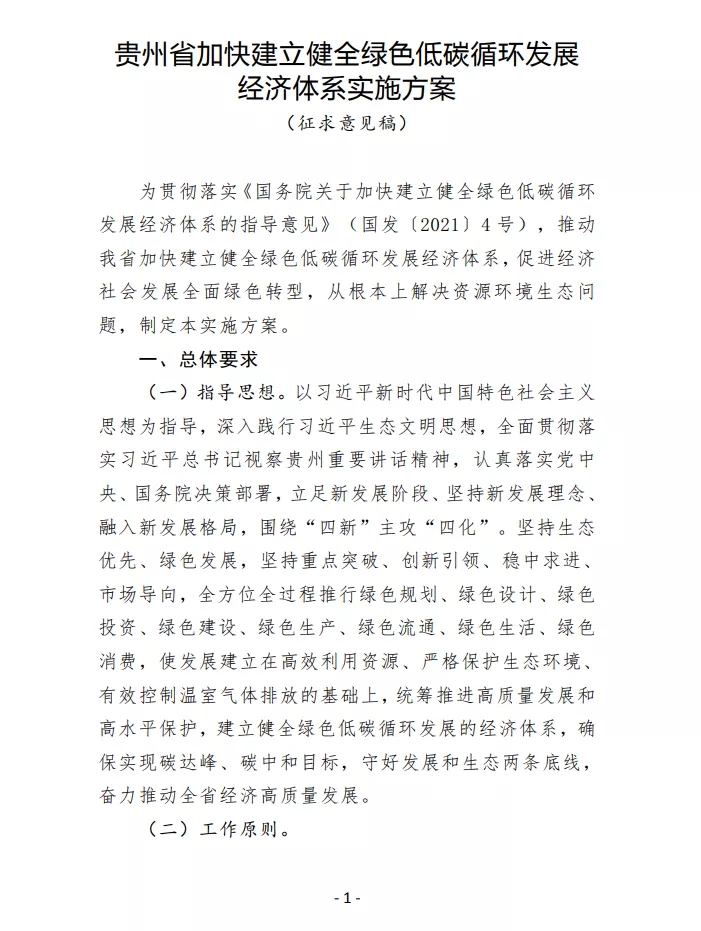 10月12日,貴州省發(fā)改委發(fā)布《貴州省加快建立健全綠色低碳循環(huán)發(fā)展經(jīng)濟(jì)體系實(shí)施方案(征求意見稿)》 公開征求意見。