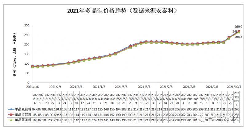 據(jù)安泰科的多晶硅價(jià)格公布,硅料已從年初87.6元/KG(單晶復(fù)投料)漲至現(xiàn)在的269.9元/KG,足足翻了3倍,而光伏組件的漲幅卻不足50%…