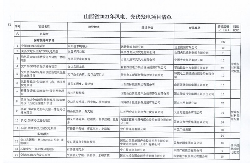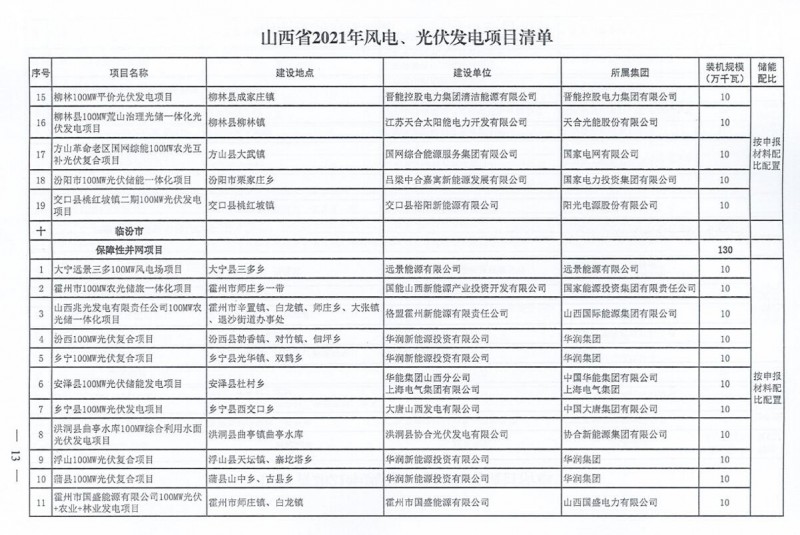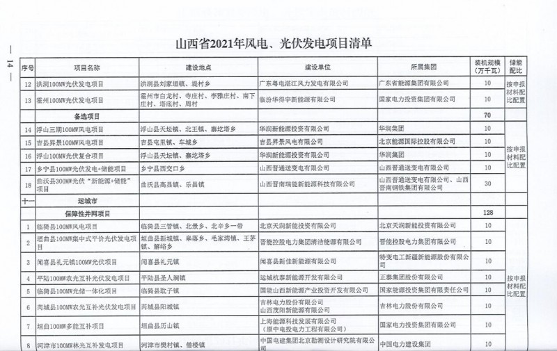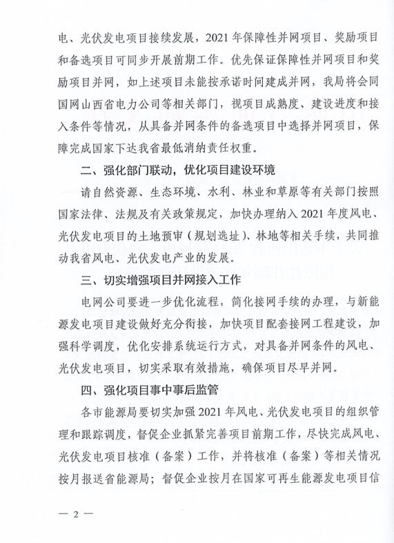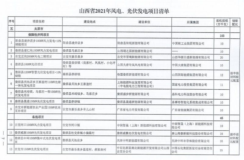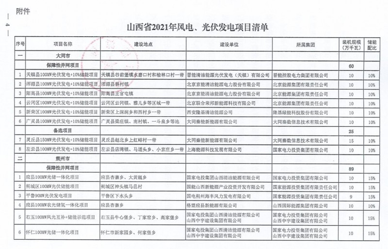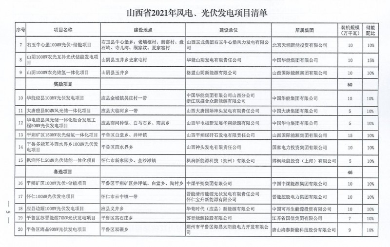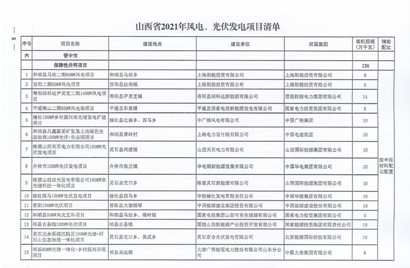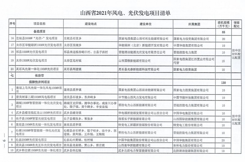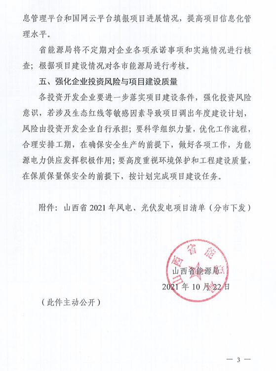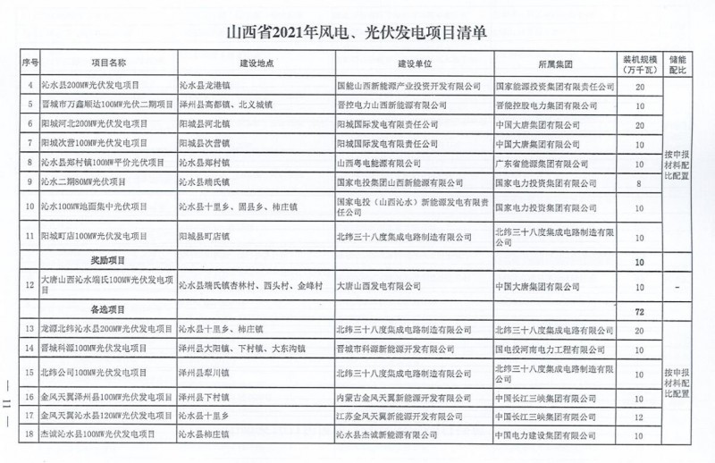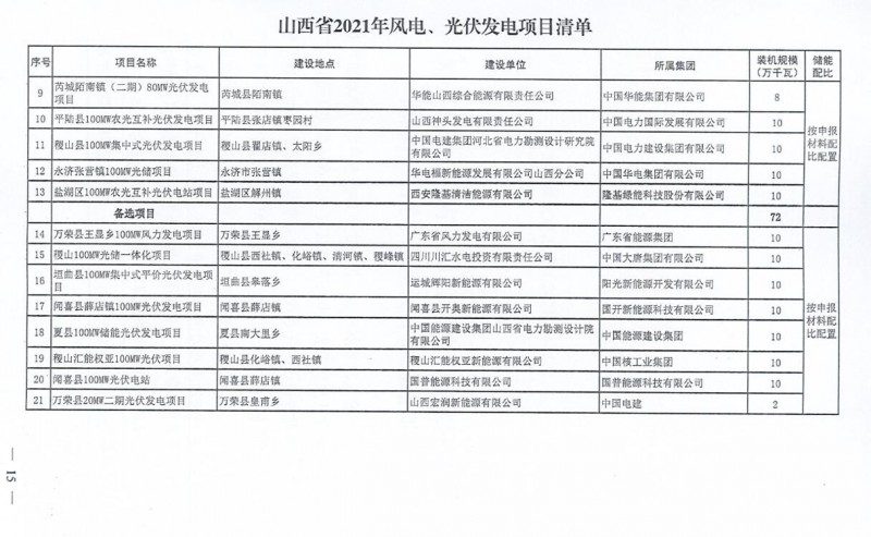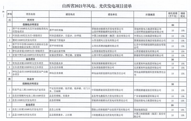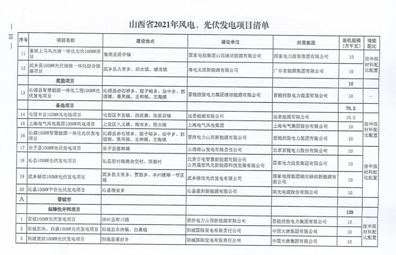 10月22日,山西省能源局下達2021年度風(fēng)電、光伏發(fā)電保障性并網(wǎng)年度建設(shè)計劃。風(fēng)、光合計17.792GW,其中保障性11.2GW+獎勵700MW+備選5.892GW。文件明確保障性規(guī)模與獎勵規(guī)??赏介_展前期工作,優(yōu)先保證保障性并網(wǎng)項目和獎勵項目并網(wǎng),如上述項目未能按承諾時間并網(wǎng),將視項目成熟度、建設(shè)進度和接入條件等,從備選項目中選擇并網(wǎng)項目,保障完成國家下達的最低消納責任權(quán)重。