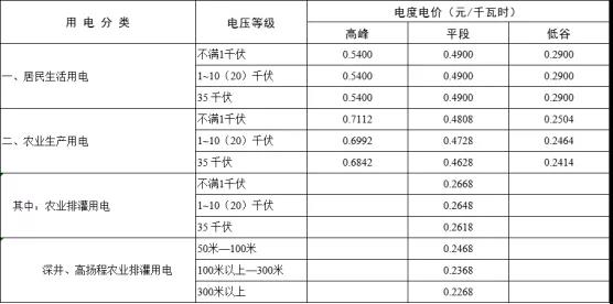 備注:1、農(nóng)村低壓各類用電按上表合計(jì)欄電價(jià)執(zhí)行,其中含維管費(fèi)。2、一戶一表居民生活用電二檔、三檔電價(jià),在一檔電價(jià)基礎(chǔ)上每千瓦時(shí)分別提高0.05元和0.3元。