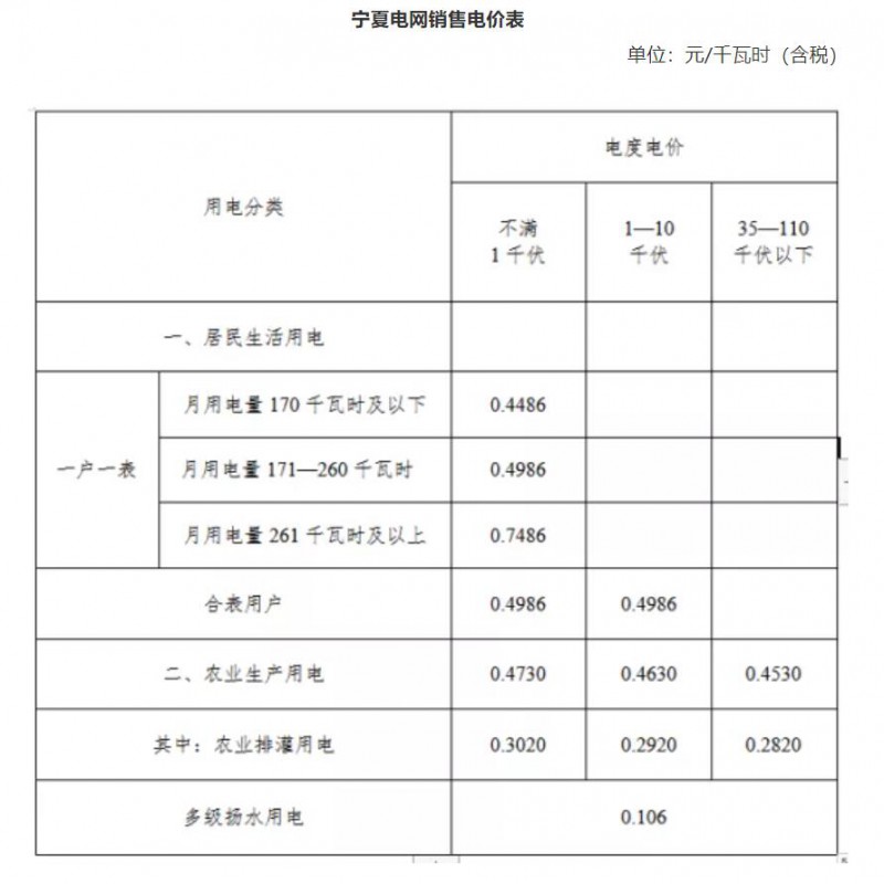 寧夏電網(wǎng)峰谷分時(shí)電價(jià)表