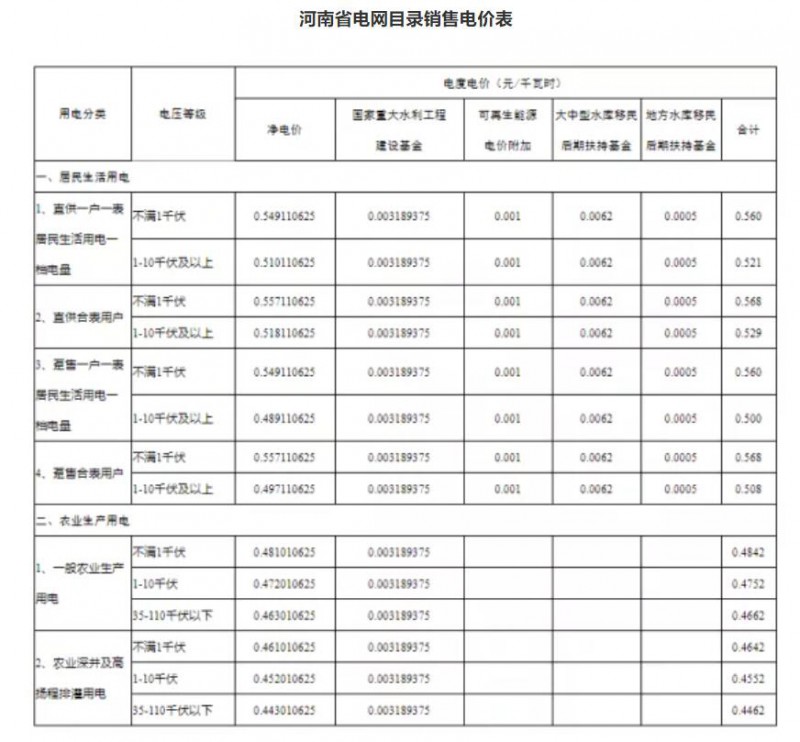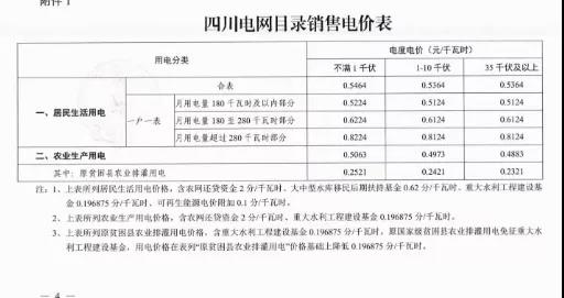 備注:1.居民生活用電,含國(guó)家重大水利工程建設(shè)基金0.196875分錢、大中型水庫(kù)移民后期扶持資金0.62分錢、可再生能源電價(jià)附加0.1分錢。2.農(nóng)業(yè)生產(chǎn)用電,含國(guó)家重大水利工程建設(shè)基金0.196875分錢。3.居民生活用電合表分類包括:居民合表及執(zhí)行居民電價(jià)的非居民用戶。