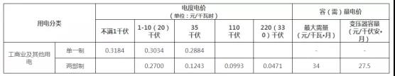 備注:1.表中各電價(jià)含增值稅、線損、交叉補(bǔ)貼及區(qū)域電網(wǎng)容量電價(jià),不含政府性基金及附加。2.參與電力市場(chǎng)化交易用戶的輸配電價(jià)水平執(zhí)行上表價(jià)格,并按規(guī)定標(biāo)準(zhǔn)另行征收政府性基金及附加。具體標(biāo)準(zhǔn)為:國(guó)家重大水利工程建設(shè)基金0.196875分錢、大中型水庫(kù)移民后期扶持基金0.62分錢、可再生能源電價(jià)附加1.9分錢。