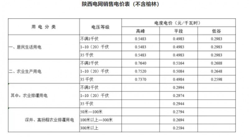 陜西電網(wǎng)輸配電價(jià)表(不含榆林)