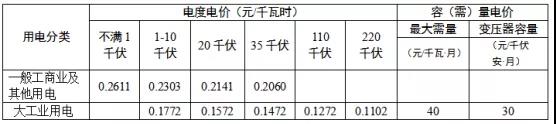 注:1. 表中電價(jià)含增值稅、線損及交叉補(bǔ)貼、區(qū)域電網(wǎng)容量電價(jià),不含政府性基金及附加。2. 一般工商業(yè)及其他、大工業(yè)用電的輸配電價(jià)水平執(zhí)行上表,并按規(guī)定標(biāo)準(zhǔn)另行征收政府性基金及附加,基金及附加標(biāo)準(zhǔn)(分/每千瓦時(shí)):國(guó)家重大水利建設(shè)基金0.403875分、大中型水庫(kù)移民扶持基金0.62分、可再生能源附加1.9分。