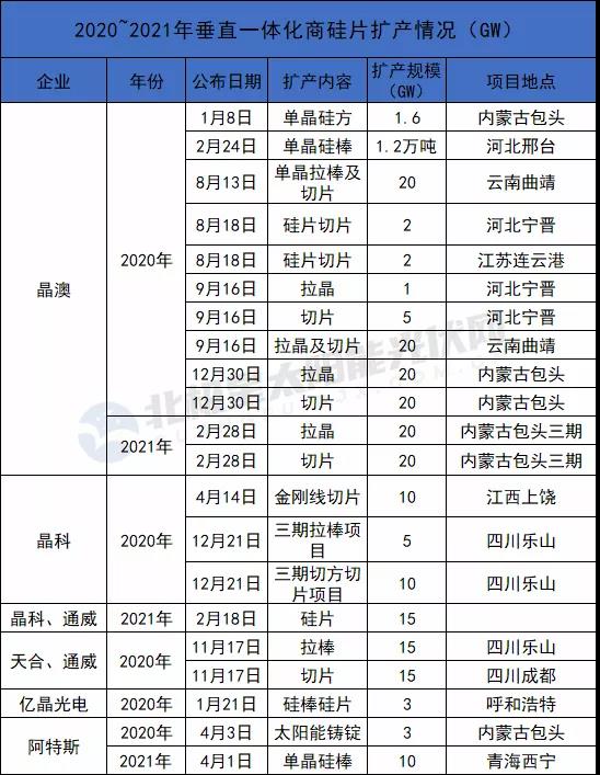 而2021年截至目前,隆基暫未公開硅片相關擴產(chǎn)計劃,2020年其在云南新擴70GW單晶產(chǎn)能。