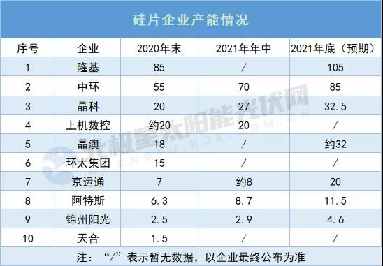根據(jù)企業(yè)財報,截至2020年底,隆基單晶硅片產(chǎn)能85GW,中環(huán)單晶硅片產(chǎn)能55GW,兩者產(chǎn)能遙遙領先于第二梯隊。