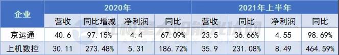 以鑄錠爐起家的京運通從2017年開始主攻硅片業(yè)務,截至2021年中,京運通單晶硅片產(chǎn)能約8GW,另有12GW新增產(chǎn)能處于爬產(chǎn)期,預計2021年底產(chǎn)能達20GW;切割設備商上機數(shù)控從2019 年通過全資子公司弘元新材進一步拓展單晶硅業(yè)務,截至2021年中,實際產(chǎn)能20GW。2020年以及2021年上半年,京運通、上機數(shù)控營收及凈利潤均實現(xiàn)了大幅增長,最高漲幅達464.59%,主要原因均指向硅片營收的大增。其中,上機數(shù)控2021年上半年營收及凈利潤均超過2020年全年。