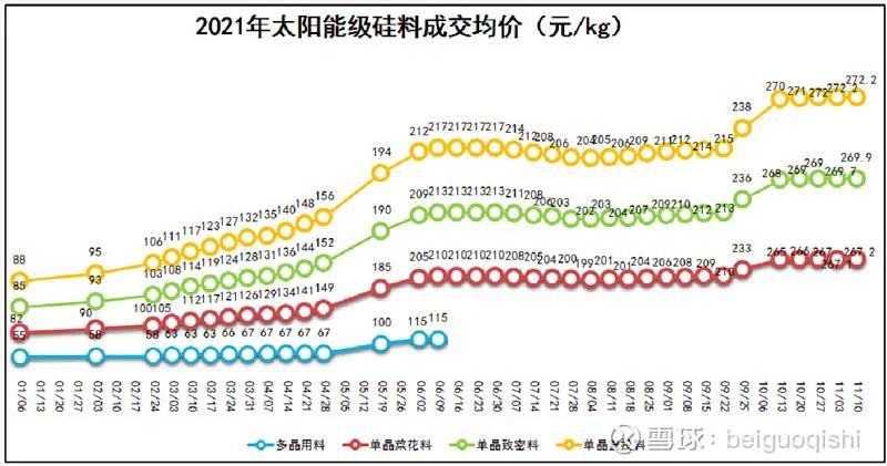 光伏原材料多晶硅價(jià)格從年初的88元/kg(復(fù)投料),一路上漲至本周的272元/kg,上漲幅度之大超出了大多數(shù)人的預(yù)期。最近一個(gè)多月一直在272元/kg左右徘徊。