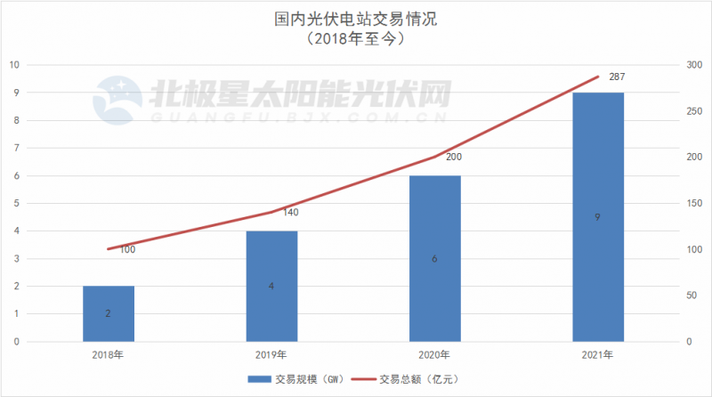 據(jù)北極星太陽能光伏網(wǎng)數(shù)據(jù)庫顯示,2018年至今,我國光伏電站交易規(guī)模正以2GW+/年速度攀升。2018年我國光伏電站交易規(guī)模在2GW以上,交易總額超100億元;2019年電站交易規(guī)模“翻倍”達(dá)到4.24GW,交易總額140多億元;2020年可統(tǒng)計(jì)的光伏電站總交易規(guī)模攀升至6.3GW,交易總額超過200億元。2021年初至今,可統(tǒng)計(jì)的光伏電站總交易規(guī)模已超9GW,交易總額287億元以上。