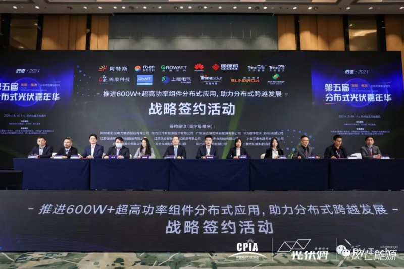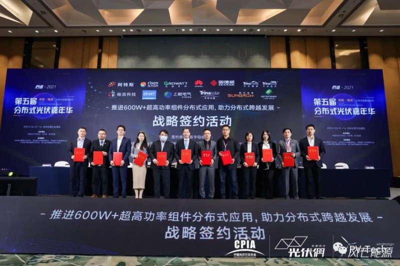 為了進(jìn)一步推動分布式場景的光伏發(fā)展,12月10日,全球領(lǐng)先光伏組件企業(yè)阿特斯、東方日升、天合光能攜天合智慧分布式、正泰太陽能,以及7家主流逆變器廠商固德威、古瑞瓦特、華為、錦浪科技、上能電氣、陽光電源和正泰電源(按首字母排序),共同舉行了戰(zhàn)略簽約儀式,聯(lián)合聲明共同推進(jìn)600W+超高功率組件分布式應(yīng)用,構(gòu)建600W+分布式應(yīng)用體系,推動分布式產(chǎn)業(yè)結(jié)構(gòu)高端化、分布式能源消費(fèi)低碳化轉(zhuǎn)型。