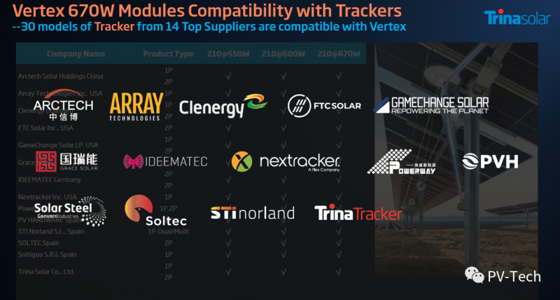 此外在系統(tǒng)適配性上,張映斌博士表示,目前已經(jīng)有21家主流逆變器廠商210余款產(chǎn)品以及14家全球跟蹤支架匹配全面適配天合210至尊系列超高功率組件。